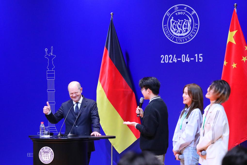 4月15日,德國(guó)總理朔爾茨(左)在同濟(jì)大學(xué)嘉定校區(qū)與學(xué)生進(jìn)行交流。新華社記者方喆 攝