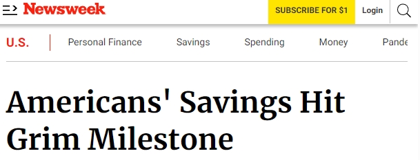 美國富國銀行(Wells Fargo)分享給《新聞周刊》(Newsweek)的一份分析報告顯示,美國人的儲蓄速度正在下降,達到一年多來的最低水平。與此同時,另一項調(diào)查指出,近38%的美國人不得不動用儲蓄或求助家人朋友以應對日常支出。有超過半數(shù)的美國人認為通脹是美國當前面臨的一個比移民和犯罪等更大的問題。