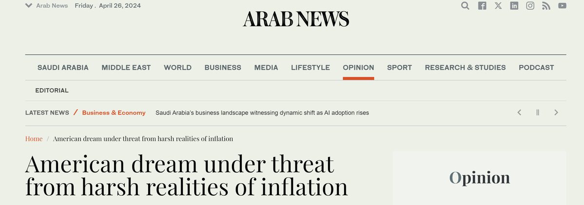 沙特阿拉伯媒體《阿拉伯新聞》網(wǎng)站4月24日刊發(fā)評論文章稱,美國通脹高企,物價不斷上漲,導(dǎo)致民眾的購買力持續(xù)下降,基本生活消費品成為無力負(fù)擔(dān)的“奢侈品”?!懊绹鴫簟北粴埧岬默F(xiàn)實擊潰。文章批評美國政府對通脹危機(jī)的反應(yīng)嚴(yán)重不足,將黨派問題置于解決民眾的迫切需求之上,削弱了民眾的信任感。