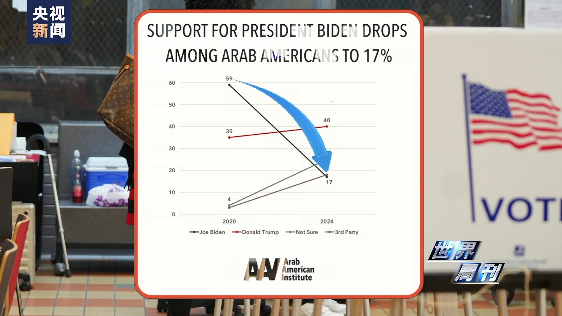 “阿拉伯裔美國人研究所”的數(shù)據(jù)也顯示,新一輪巴以沖突爆發(fā)后,拜登在阿拉伯裔選民中的支持率已由2020年的59%暴跌至17%。