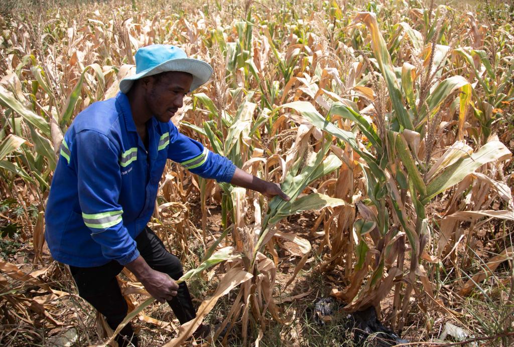 4月3日,農民在津巴布韋首都哈拉雷近郊的一塊玉米地檢查作物長勢。津巴布韋總統(tǒng)姆南加古瓦宣布,由于厄爾尼諾現(xiàn)象造成嚴重干旱,全國進入災害狀態(tài)。新華社發(fā),肖恩·朱薩攝