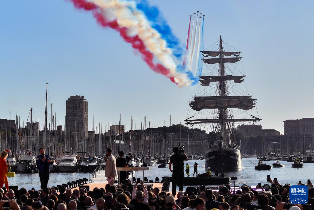 ??傍晚時(shí)分,伴隨著現(xiàn)場(chǎng)觀眾高唱法國國歌《馬賽曲》,“貝勒姆”號(hào)緩緩駛進(jìn)港口,著名的“法蘭西巡邏兵”飛行表演隊(duì)從港口上空呼嘯而過,先后展示了奧運(yùn)五環(huán)與法國國旗的圖案。