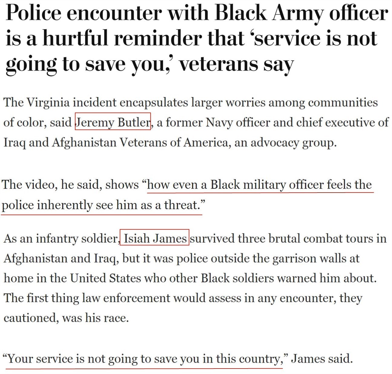 曾在阿富汗和伊拉克的三次殘酷戰(zhàn)斗中幸存下來的非裔美軍士兵伊塞亞·詹姆斯退役后,曾被其他非裔戰(zhàn)友“友情提醒”:打仗不是最可怕的,真正要小心的是美國警察,“在這個(gè)國家,即使在軍中服役也救不了你”。