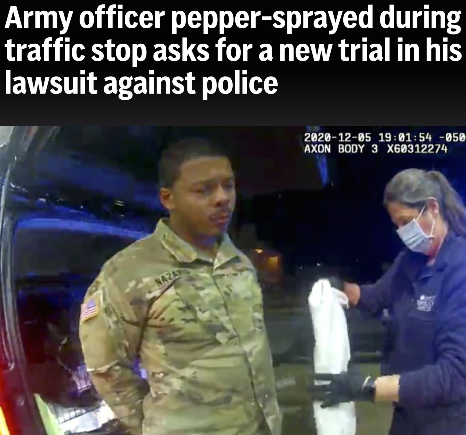 2020年12月,非洲和拉丁裔混血的美國陸軍少尉卡倫·納扎里奧在弗吉尼亞州溫莎市駕駛新買的汽車回家途中,遭遇兩名警察歧視性執(zhí)法。后者不僅以“無照駕車”為由用槍威逼納扎里奧下車,還對(duì)他進(jìn)行毆打并使用胡椒噴霧。