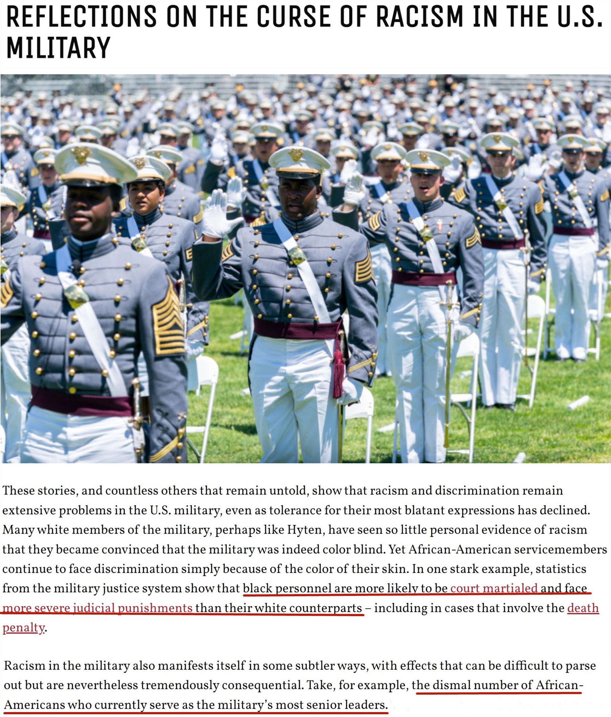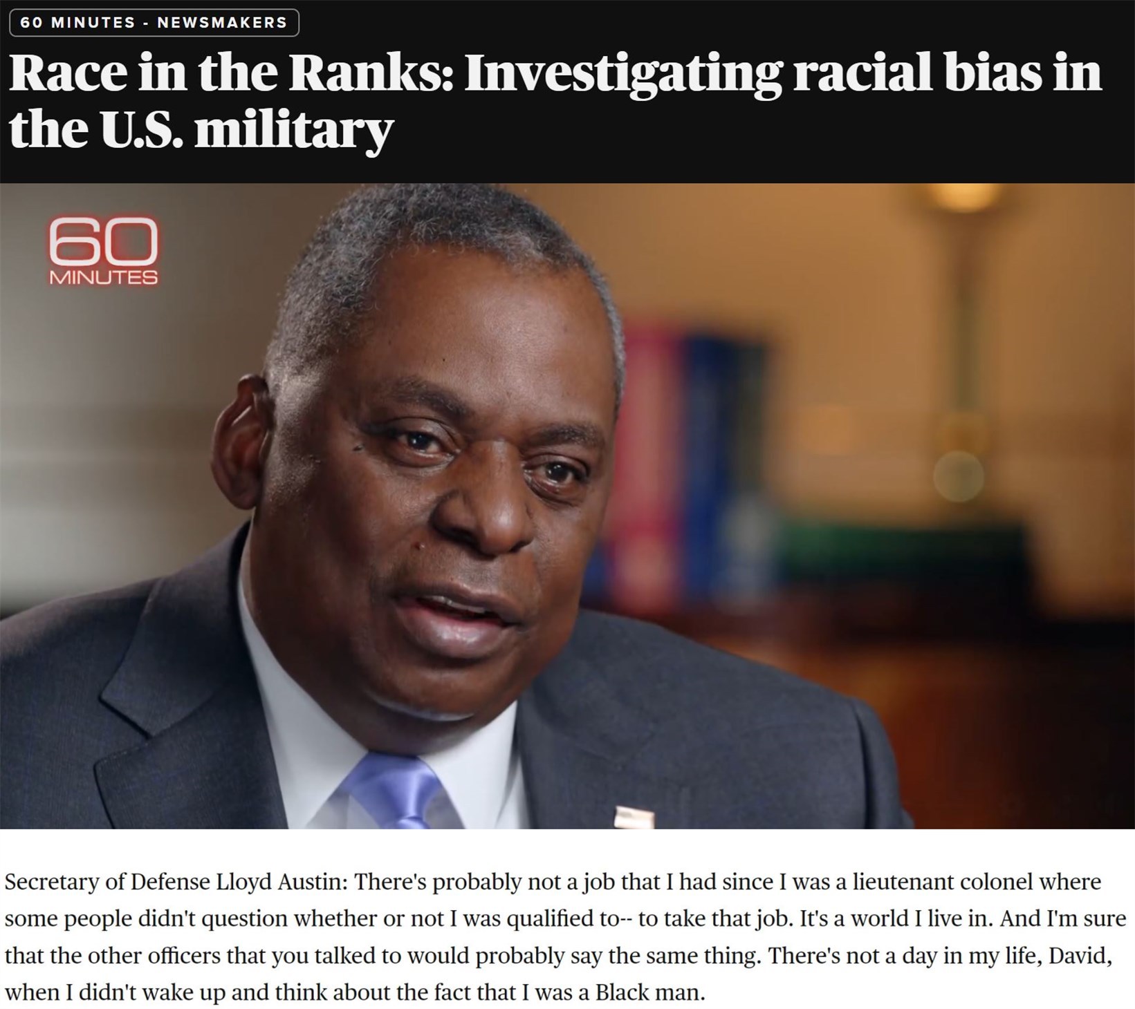 “(非裔)在晉升方面的處境仍無改觀,總是有人會(huì)因?yàn)槟愕臉用捕鴮?duì)你的任職資格提出疑問,這就是我生活的世界,而且我非??隙▌e的(非裔)軍官也會(huì)說同樣的話。在我生命中的每一天,早晨醒來都會(huì)思考這個(gè)事實(shí):我是一個(gè)非洲裔。”