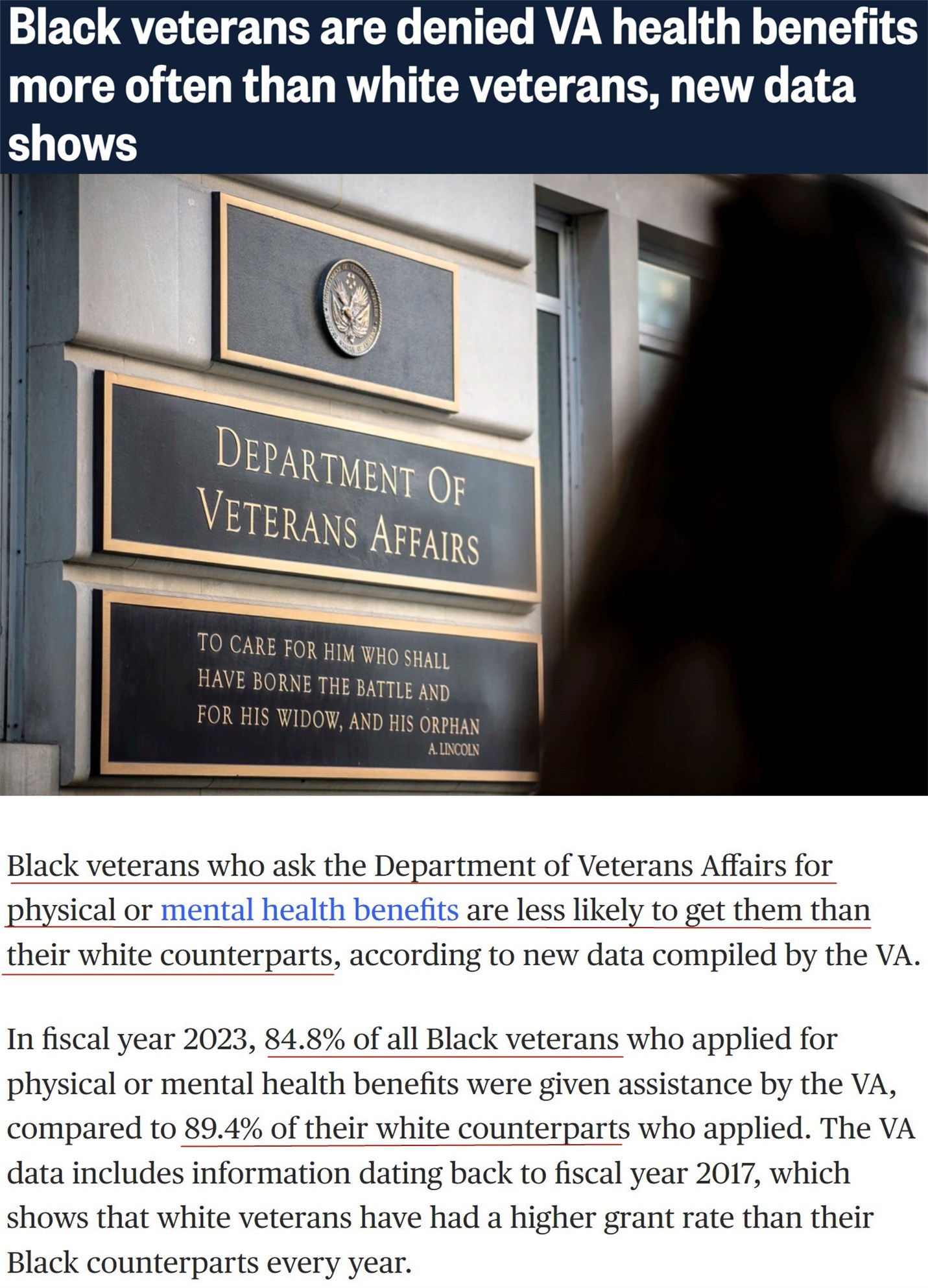 △美國全國廣播公司網(wǎng)站:在2023財(cái)年,申請(qǐng)身心健康福利的所有非裔退役軍人中有84.8%獲得了退役軍人事務(wù)部的援助,而白人退役軍人的這一比例為89.4%。