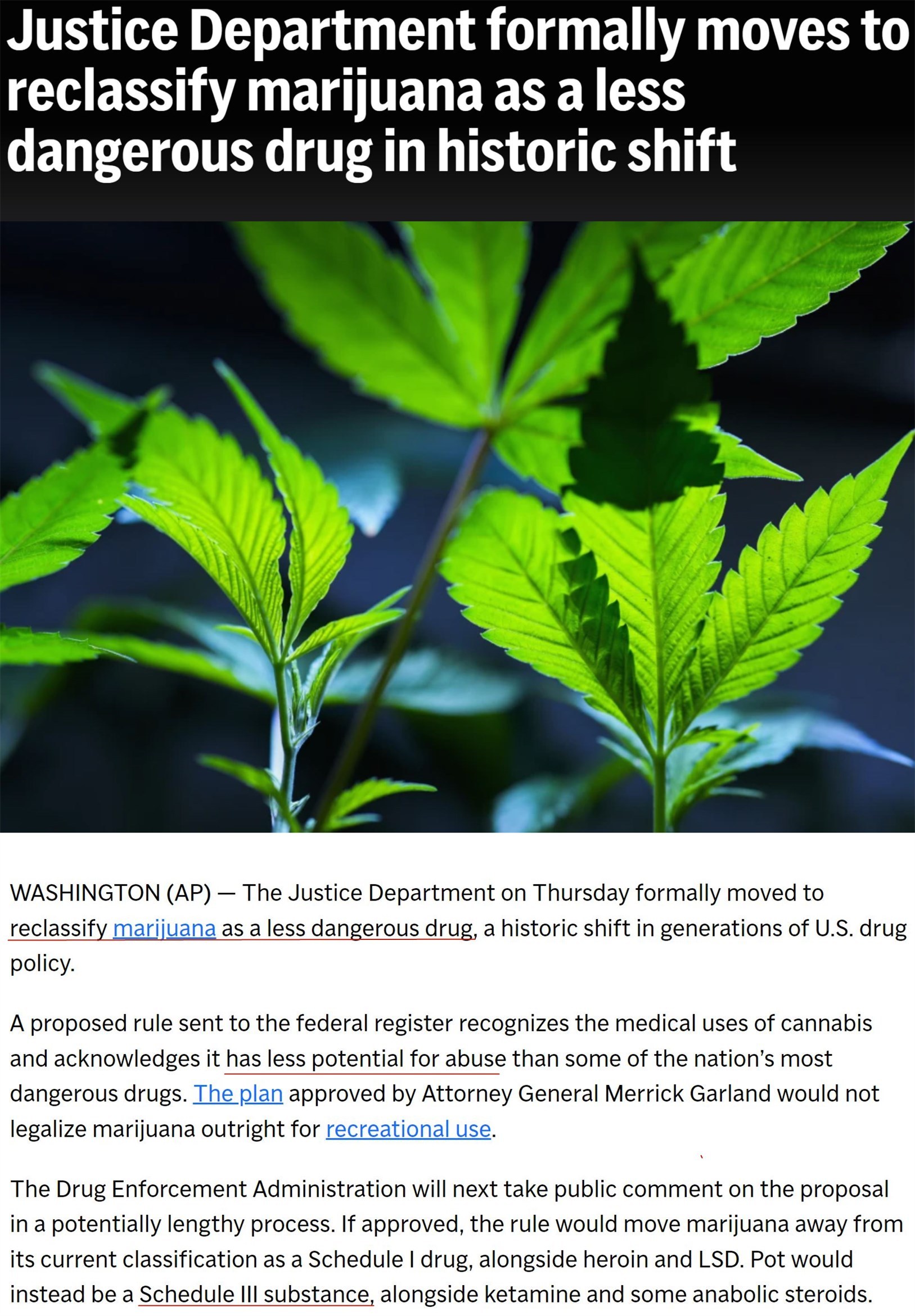 如果經(jīng)過(guò)60天的公眾意見(jiàn)征詢(xún)期后最終獲批,新規(guī)則雖然不會(huì)在聯(lián)邦層面將大麻完全合法化,但會(huì)將其移出《美國(guó)聯(lián)邦管制物質(zhì)法案》中列管海洛因等最危險(xiǎn)毒品的“附表一”,轉(zhuǎn)而歸入列管氯胺酮和類(lèi)固醇等危險(xiǎn)性較低藥物的“附表三”。