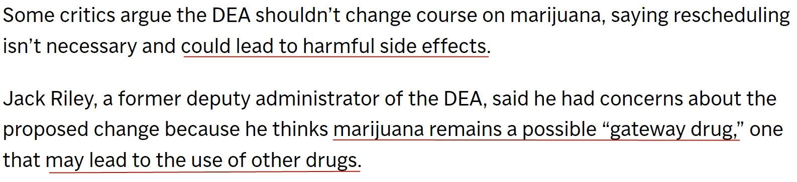美國(guó)禁毒署前副署長(zhǎng)杰克·萊利對(duì)擬議中的規(guī)則更改感到擔(dān)憂(yōu)。他認(rèn)為,大麻仍是一種“入門(mén)毒品”,可能導(dǎo)致對(duì)其他毒品的使用。