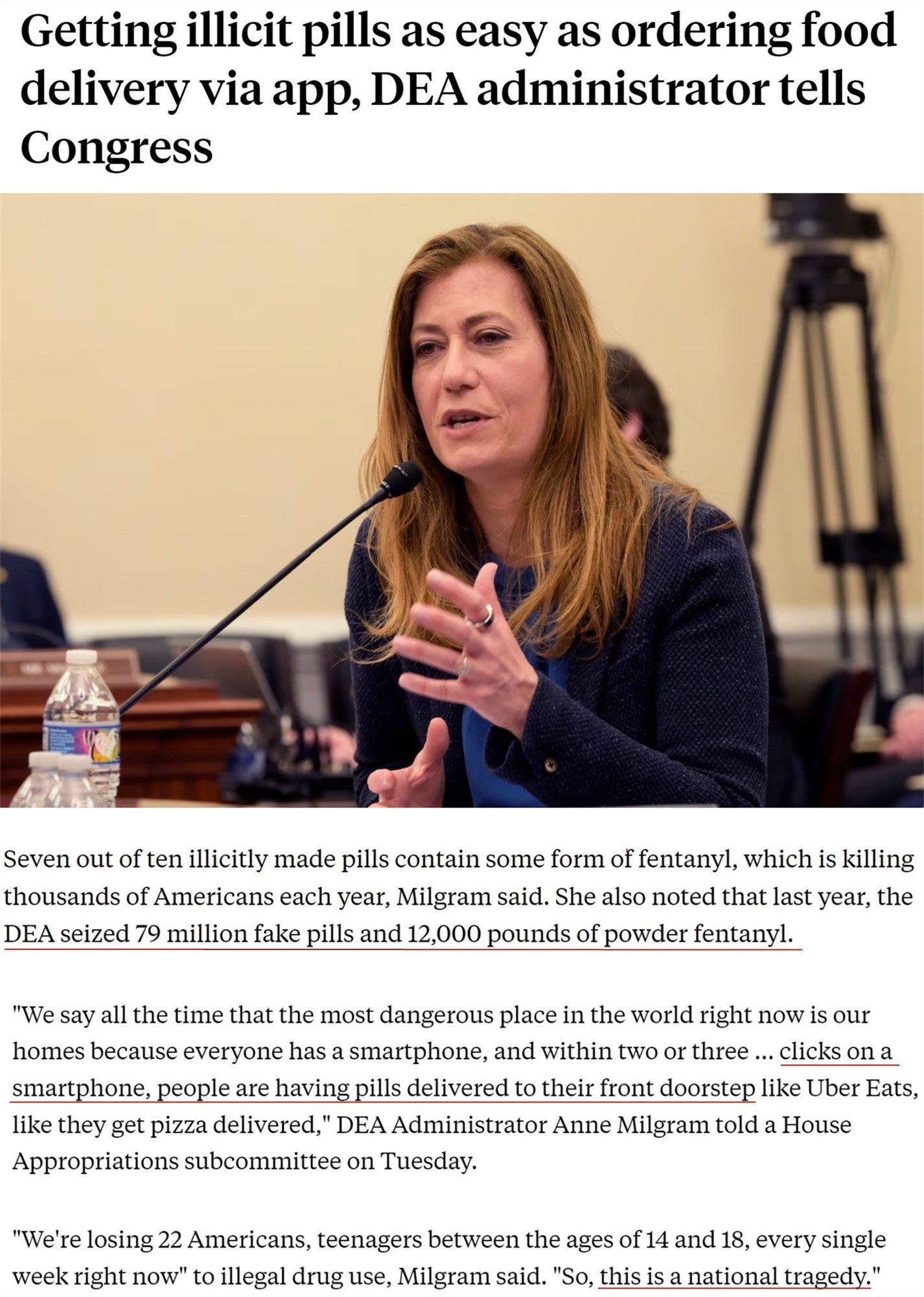美國(guó)禁毒署署長(zhǎng)安妮·米爾格拉姆本月早些時(shí)候告訴國(guó)會(huì):“現(xiàn)在世界上最危險(xiǎn)的地方就是我們的家,因?yàn)槊總€(gè)人都有智能手機(jī),只要用手指點(diǎn)上兩三下,就能像在外賣(mài)平臺(tái)點(diǎn)比薩一樣,在家門(mén)口收到非法藥丸?!?/p>