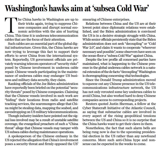 原標(biāo)題:Washington's hawks aim at 'subsea Cold War'