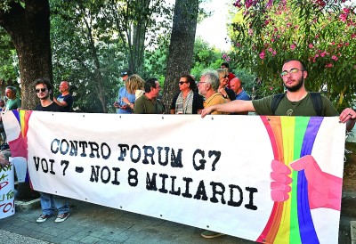 6月14日,在意大利法薩諾,抗議者打出“你們只有七個(gè),我們是八十億人”的標(biāo)語,批評(píng)七國集團(tuán)與世界完全割裂。新華社記者 李京攝