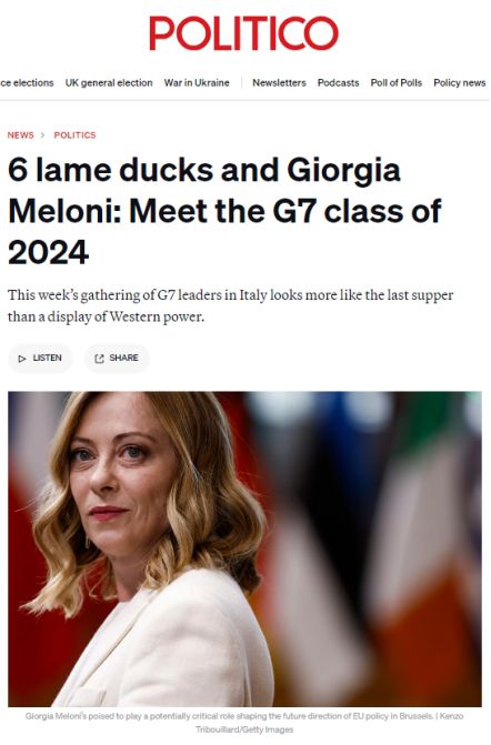 面對各自國內嚴峻的政治形勢,本次G7峰會開得真有些力不從心、心猿意馬。法德兩國領導人所在政黨在上周剛剛結束的歐洲議會選舉中表現(xiàn)堪憂;英國首相蘇納克更在朝不保夕中擔憂著自己的保守黨會在下月初大選中走到窮途末路;美國總統(tǒng)拜登更是處處遭逢著大選對手特朗普的咄咄逼人。美國政客新聞網歐洲版(Politico.eu)捕捉到了這種有趣的心不在焉的會議氛圍,以《六只跛腳鴨和梅洛尼》為題諷刺總結本次峰會,“在意大利舉行的七國集團峰會看起來更像是最后的晚餐,而不是西方力量的展示”。