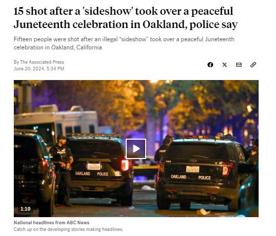 據(jù)美國廣播公司(ABC)報(bào)道,當(dāng)?shù)貢r(shí)間20日,美國警方表示,加利福尼亞州奧克蘭市19日晚發(fā)生槍擊事件,已造成15人受傷。