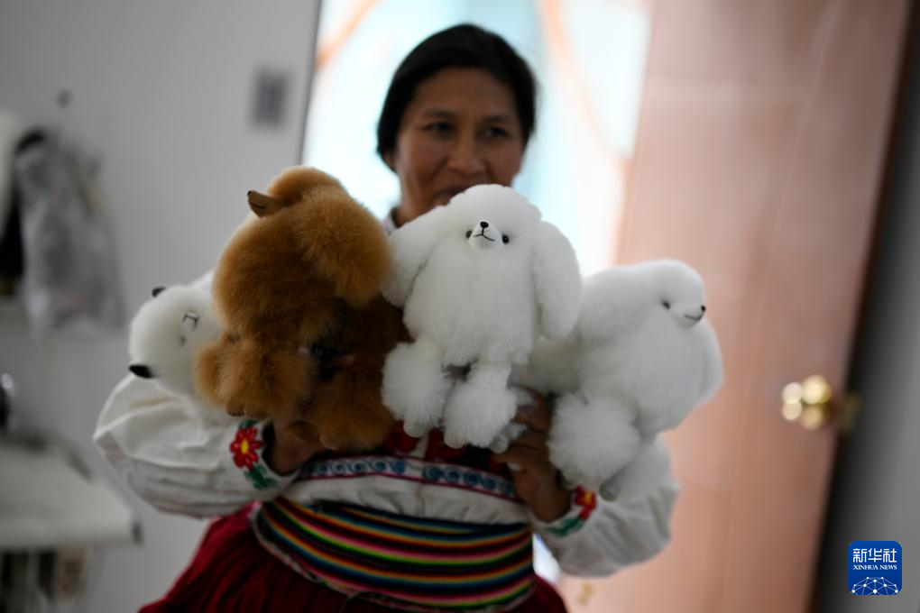 6月20日,在秘魯阿雷基帕,手工藝人奧斯瓦爾多·馬馬尼的妻子展示羊駝毛制作的動物玩偶。新華社記者 李木子 攝