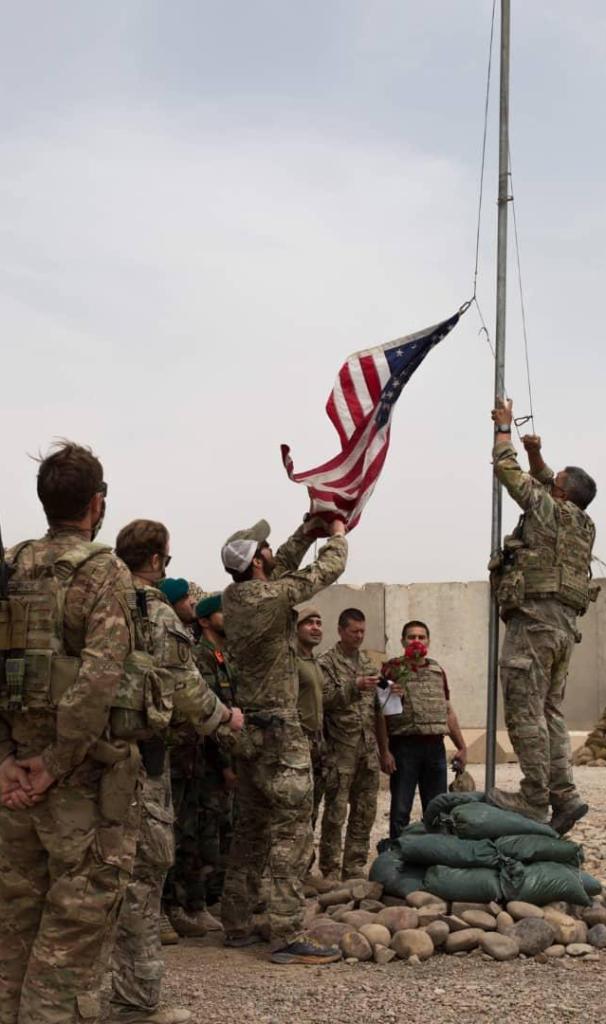 2021年5月2日,美軍士兵在阿富汗赫爾曼德省一處軍事基地降下美國國旗。當(dāng)日,美軍向阿富汗國民軍移交這處軍事基地。美國和北約軍隊(duì)5月1日起正式開始撤離阿富汗,計(jì)劃在9月11日前撤完。新華社發(fā)(阿富汗國防部供圖)