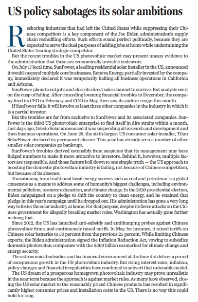 自2012年起,美國(guó)就開(kāi)始對(duì)中國(guó)光伏企業(yè)發(fā)起反補(bǔ)貼和反傾銷(xiāo)調(diào)查,并不斷提高關(guān)稅。例如,今年5月,美國(guó)白宮宣布,對(duì)中國(guó)產(chǎn)太陽(yáng)能電池征收的關(guān)稅將從原先的25%上調(diào)至50%。在限制中國(guó)對(duì)美出口的同時(shí),拜登政府簽署的《通脹削減法案》還撥款3690億美元應(yīng)對(duì)氣候變化、維護(hù)能源安全,承諾將借此對(duì)國(guó)內(nèi)光伏企業(yè)實(shí)施補(bǔ)貼。