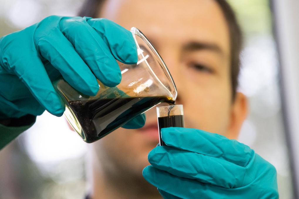 2022年5月24日,在匈牙利薩茲豪隆包陶多瑙河煉油廠,一名工人對通過阿德里亞輸油管道運達的原油樣品進行質量分析。新華社發(fā)(弗爾季·奧蒂洛攝)