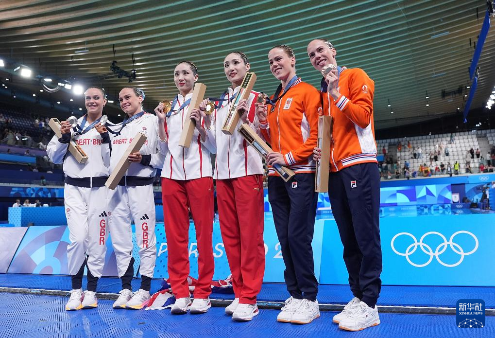 8月10日,冠軍中國組合王柳懿/王芊懿(前)、亞軍英國組合凱特/索普(后左)、季軍荷蘭組合布雷赫耶/諾爾蒂在頒獎儀式上合影。新華社記者 薛宇舸 攝