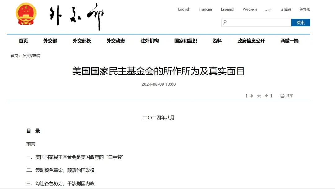 8月9日,中國(guó)外交部網(wǎng)站發(fā)布一份重磅報(bào)告:《美國(guó)國(guó)家民主基金會(huì)的所作所為及真實(shí)面目》。