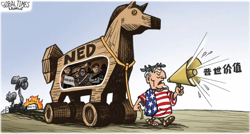 長(zhǎng)期以來,美國(guó)將所謂普世價(jià)值工具化、武器化,煽動(dòng)分裂對(duì)抗,干涉別國(guó)內(nèi)政,造成災(zāi)難性后果。NED就是美國(guó)政府禍亂別國(guó)的“特洛伊木馬”。圖源:《環(huán)球時(shí)報(bào)》