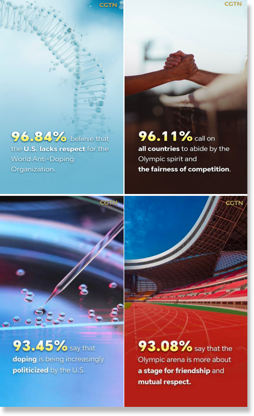 總臺CGTN先后兩次發(fā)起全球民調(diào),調(diào)查顯示,96.84%的受訪者認為美方缺乏對世界反興奮劑機構的尊重,是在挑戰(zhàn)公平和權威;96.25%的受訪者痛批美國在興奮劑監(jiān)管方面“雙重標準”;93.45%的受訪者表示,興奮劑問題日益被美國政治化和工具化;95.57%的受訪者認為美國反興奮劑機構或存包庇行為,為涉興奮劑的美國運動員開脫……
