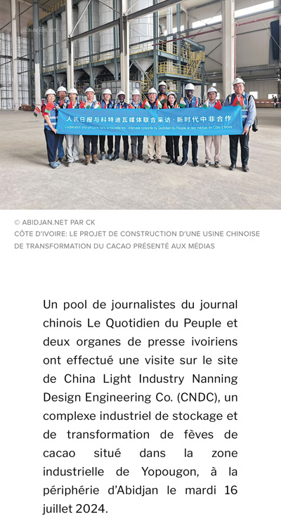 7月16日,人民日報與兩家科特迪瓦新聞機構記者一行參觀了由中國輕工業(yè)南寧設計工程有限公司總承包的可可加工及可可豆倉庫建設項目,該項目坐落在阿比讓郊區(qū)的約普貢工業(yè)區(qū)。
