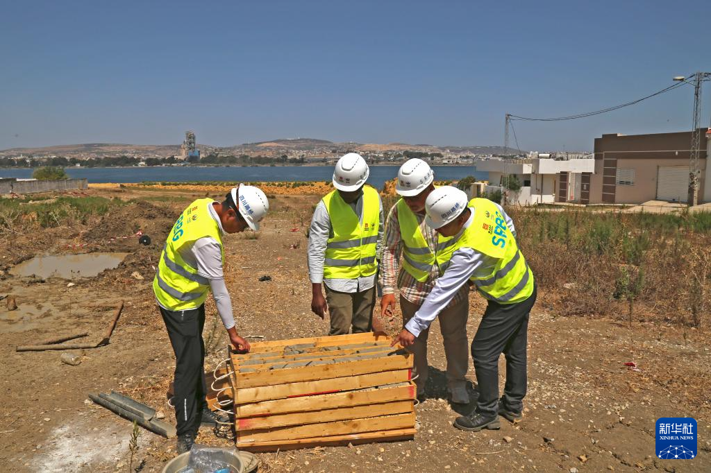 8月12日,在突尼斯比塞大,四川公路橋梁建設(shè)集團(tuán)有限公司工作人員與突尼斯工程師在比塞大運(yùn)河附近進(jìn)行地質(zhì)勘探工作。 新華社發(fā)(阿代爾攝)