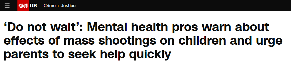 薩爾茲和羅辛-斯萊特都警告表示,(美國(guó)社會(huì))急需對(duì)校園槍擊事件或一般槍支暴力事件中幸存的兒童及青少年出現(xiàn)的心理健康問題作出反應(yīng),這對(duì)保護(hù)他們的未來至關(guān)重要。