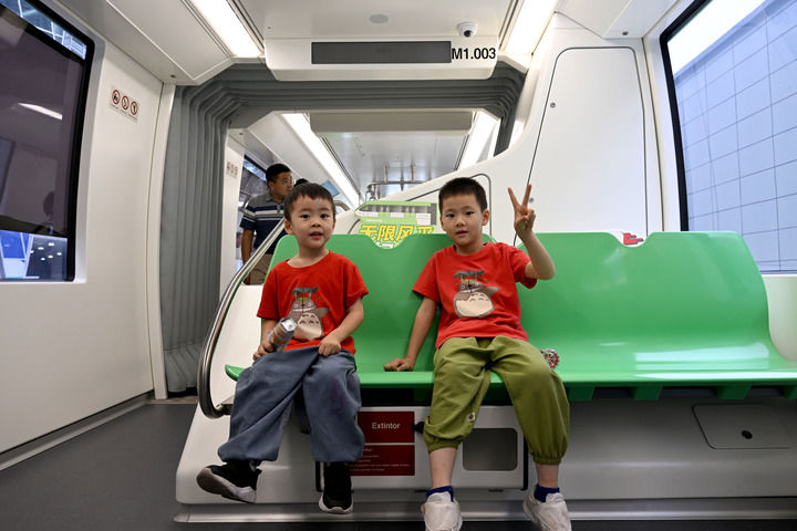 9月21日,在2024世界制造業(yè)大會上,小朋友參觀體驗(yàn)阿爾斯通跨座式單軌列車。新華社記者 黃博涵 攝