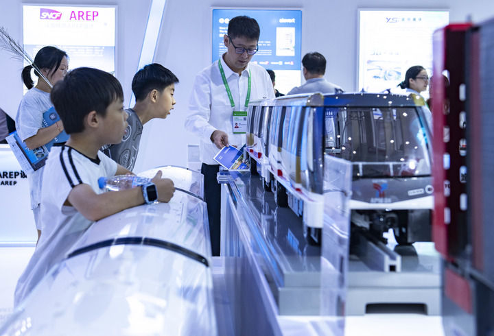 9月21日,小朋友在2024世界制造業(yè)大會上了解自動旅客捷運(yùn)系統(tǒng)模型。新華社記者 傅天 攝
