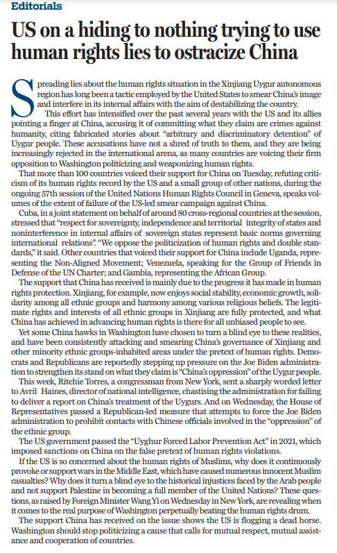 9月24日,日內(nèi)瓦舉行的聯(lián)合國人權(quán)理事會第五十七屆會議上,美國等少數(shù)國家發(fā)言攻擊抹黑中國人權(quán)狀況。對此,100多個(gè)國家以共同發(fā)言、單獨(dú)發(fā)言等不同方式仗義執(zhí)言,支持中方正義立場。
