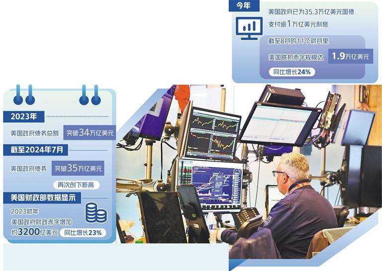 美國財政部9月12日發(fā)布的月度聯(lián)邦政府收支報告顯示,今年美國政府已為35.3萬億美元國債支付逾1萬億美元利息。償債成本上升也與美國8月財政赤字大幅上升相吻合。截至8月的前11個財月里,美國聯(lián)邦赤字規(guī)模達1.9萬億美元,同比增長24%。美國財政赤字曾在2020財年達到3.13萬億美元的峰值,此后兩年雖呈下降趨勢,但在2023財年又有所上漲:美國財政部數(shù)據(jù)顯示,2023財年美國政府的財政赤字增加了約3200億美元,同比增長23%。一方面,經濟的衰退和各種減稅法案的實施導致財政收入減少;另一方面,為刺激經濟增長,財政支出又不斷增加,這就導致財政赤字不斷攀升,只有通過發(fā)債彌補財政赤字,形成惡性循環(huán)。