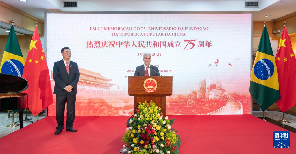 9月25日,巴西副外長勞德馬爾(右)在巴西利亞舉行的慶祝中華人民共和國成立75周年招待會(huì)上致辭。新華社記者 王天聰 攝