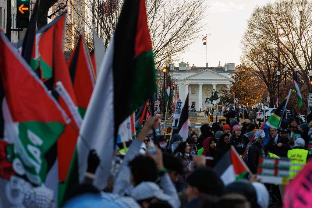 1月13日,在美國首都華盛頓,人們參加聲援巴勒斯坦的集會游行活動。大批示威者揮舞旗幟和標(biāo)語,高喊口號聲援巴勒斯坦,呼吁?;?。新華社發(fā)(亞倫攝)