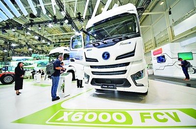 9月16日,在德國漢諾威國際交通運輸博覽會媒體預展上,參觀者在陜汽控股展區(qū)了解一款氫燃料電池牽引車。新華社發(fā)