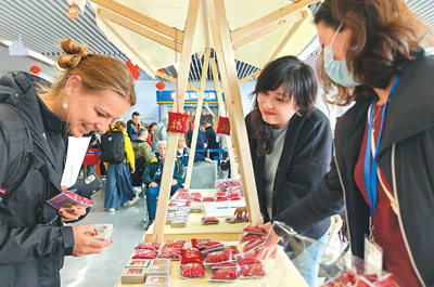 入境游客在上海吳淞口國(guó)際郵輪港到達(dá)大廳設(shè)立的攤位前駐足,了解文創(chuàng)產(chǎn)品。新華社記者 陳愛(ài)平攝