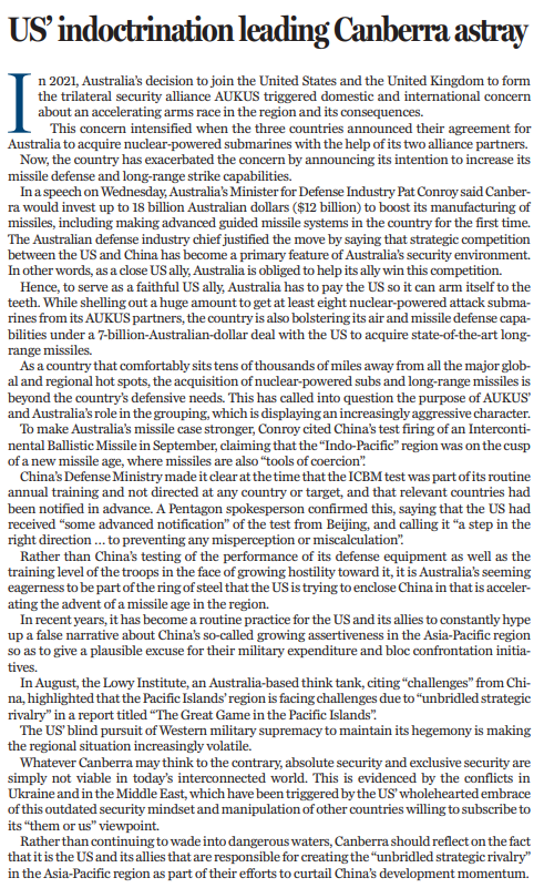 作為一個遠離全球和地區(qū)主要熱點的國家,購買核動力潛艇和遠程導(dǎo)彈超出了澳大利亞的防御需要。這不禁令人對“奧庫斯”的目的以及澳大利亞在其中的作用產(chǎn)生疑問,因為“奧庫斯”表現(xiàn)出越來越強的攻擊性。