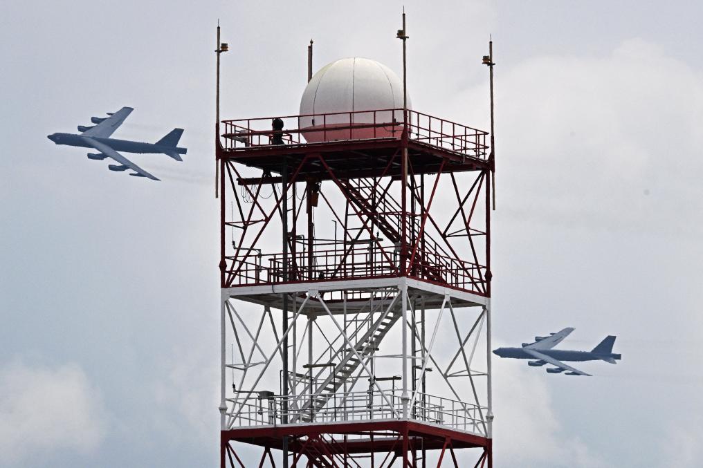 2024年2月22日,兩架美國(guó)空軍B-52轟炸機(jī)在新加坡航展上做飛行表演。新華社發(fā)(鄧智煒攝)