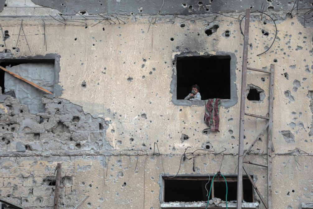 10月7日清晨,在加沙地帶南部汗尤尼斯,一名兒童站在一棟受損建筑的窗旁。新華社發(fā)(里澤克·阿卜杜勒賈瓦德攝)