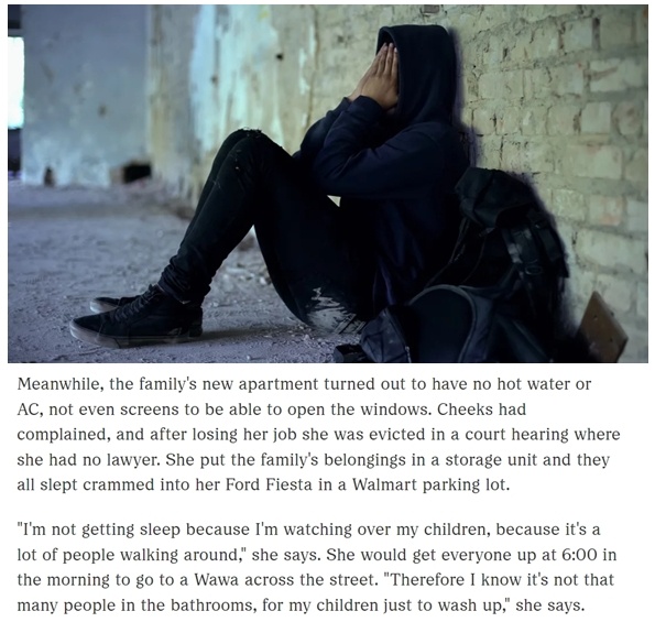 在弗吉尼亞州生活的奇克斯是一位獨(dú)自撫養(yǎng)四個孩子的母親。由于失業(yè)后無力負(fù)擔(dān)房租,她和四個孩子的臨時住房是一輛小轎車,這輛車長期停在一家超市的停車場里。