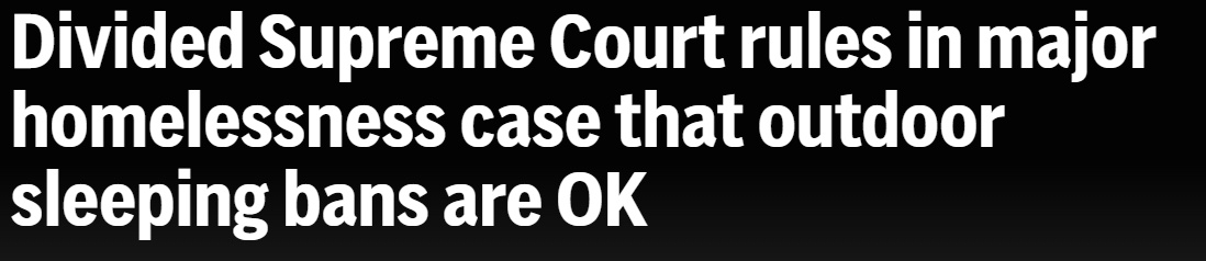 更令人唏噓的是,面對越來越多的人流浪街頭,今年6月底,美國最高法院以6:3的判決結(jié)果,允許各地政府實(shí)施禁止無家可歸者在戶外露宿的禁令。