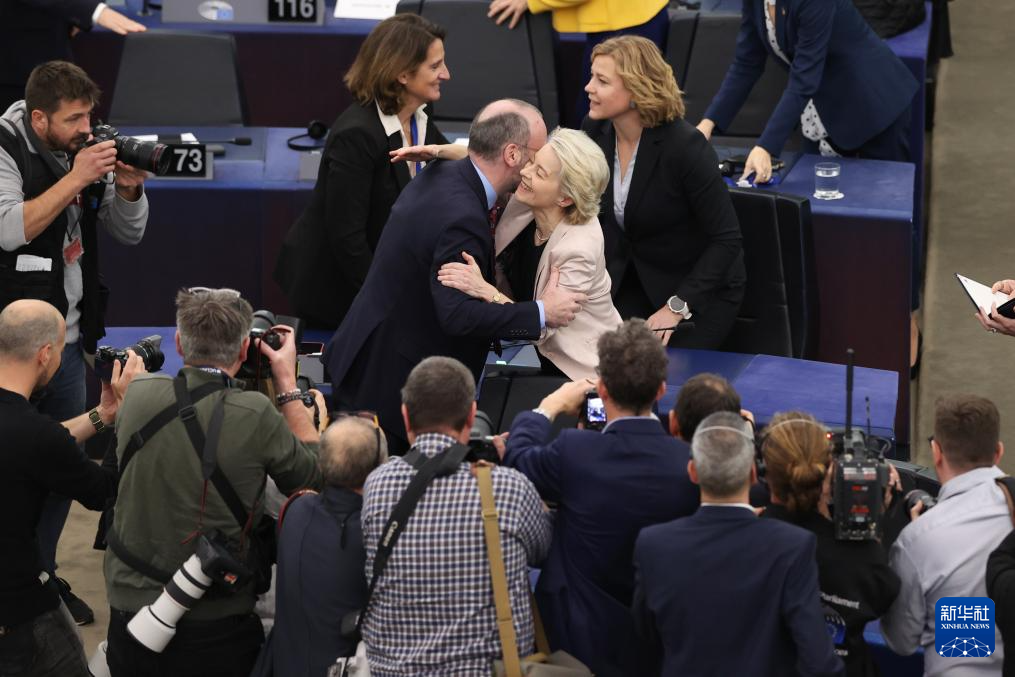 11月27日,在法國斯特拉斯堡歐洲議會會議現(xiàn)場,馮德萊恩(中右)在新一屆歐盟委員會(歐委會)委員名單投票通過后慶祝。新華社記者 趙丁喆 攝