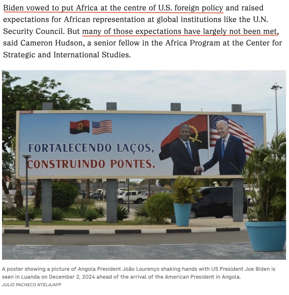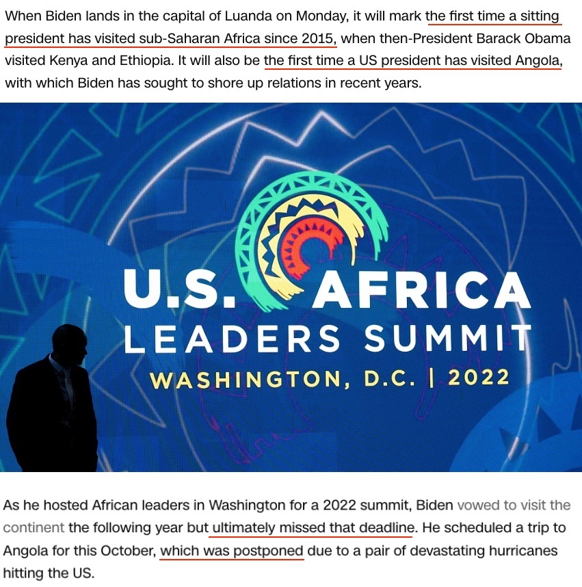 △美國有線電視新聞網(wǎng)報(bào)道:這是一場拖了太久的訪問。2022年在華盛頓舉行的美非峰會(huì)上,拜登曾承諾2023年訪問非洲,但他食言了。即便是這次原本安排在10月的安哥拉之行也因美國國內(nèi)發(fā)生颶風(fēng)災(zāi)害而推遲。