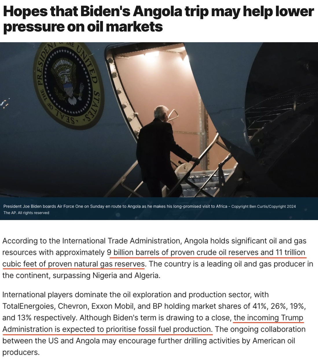 雖然拜登的任期即將結(jié)束,但預(yù)計(jì)即將上任的特朗普政府將優(yōu)先考慮化石燃料生產(chǎn)。美國和安哥拉之間正在進(jìn)行的合作可能會(huì)鼓勵(lì)美國石油生產(chǎn)商進(jìn)一步開展鉆探活動(dòng)。