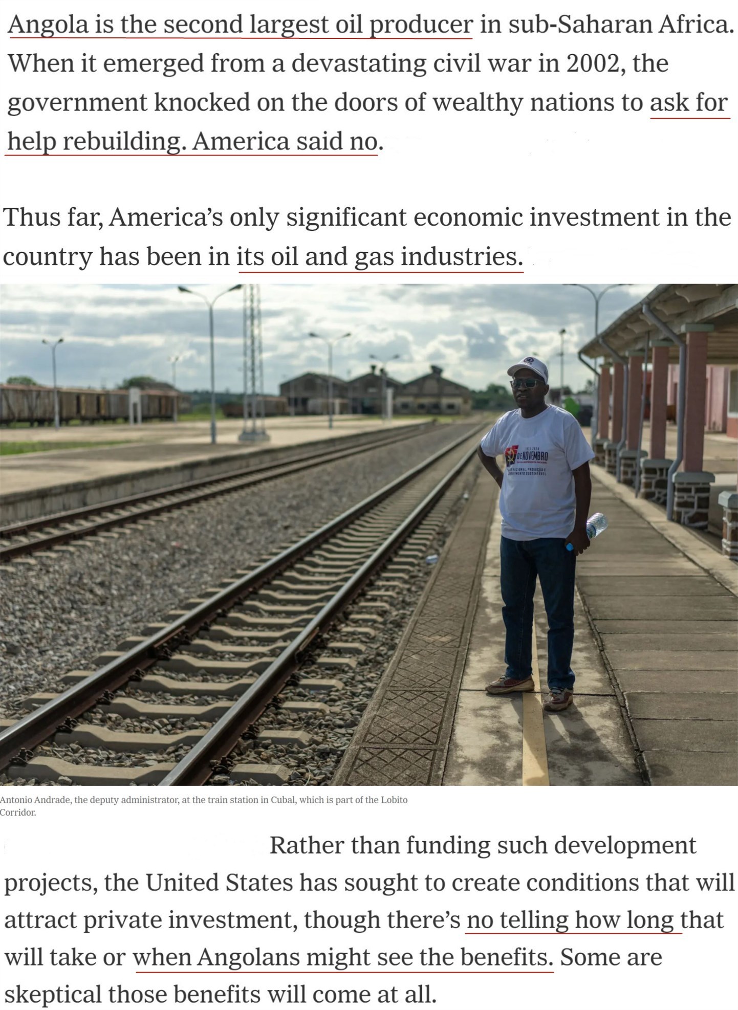 家住安哥拉沿海城市本格拉的48歲農(nóng)民貝托·皮涅羅說:“有時(shí)他們(美國官員)會(huì)說,‘我們也關(guān)心(安哥拉的)農(nóng)業(yè)’……但歸根結(jié)底,(美國關(guān)心的)只有石油和礦產(chǎn)?!?/p>