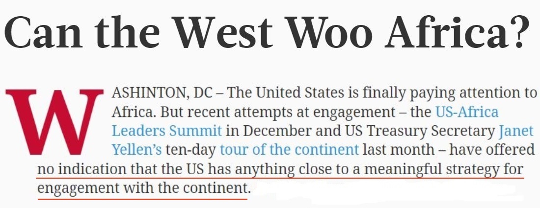 △世界報(bào)業(yè)辛迪加網(wǎng)站:雖然非洲以其快速增長的人口、豐富的資源以及龐大的聯(lián)合國會(huì)員國席位數(shù)目重新受到了美國的關(guān)注,但沒有任何跡象表明美國已制定出與非洲加強(qiáng)接觸的有意義的戰(zhàn)略。