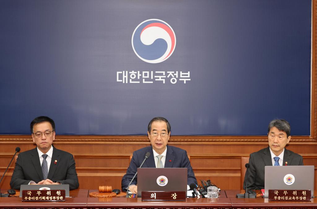 12月14日,在韓國(guó)首都首爾,代行總統(tǒng)職權(quán)的韓國(guó)國(guó)務(wù)總理韓德洙(中)召開臨時(shí)國(guó)務(wù)會(huì)議。新華社/紐西斯通訊社