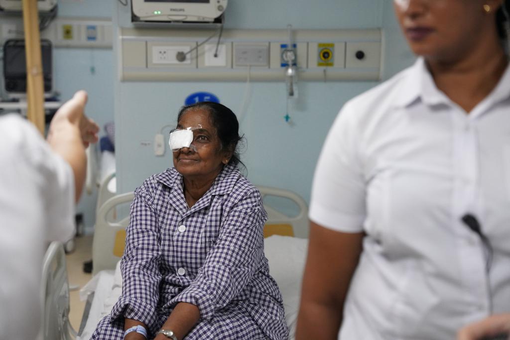 這是2024年12月24日在斯里蘭卡科倫坡港??康闹袊\姟昂推椒街邸碧栣t(yī)院船上拍攝的剛進行完白內(nèi)障手術(shù)的本地患者。(新華社記者伍岳攝)