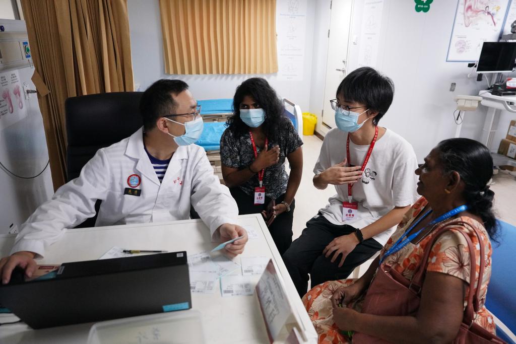 2024年12月24日,在斯里蘭卡科倫坡港,中國海軍“和平方舟”號醫(yī)院船上的醫(yī)生在志愿者的幫助下對當?shù)鼗颊哌M行問診。(新華社記者伍岳攝)