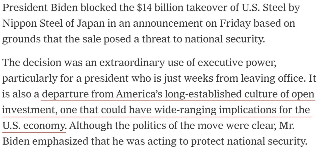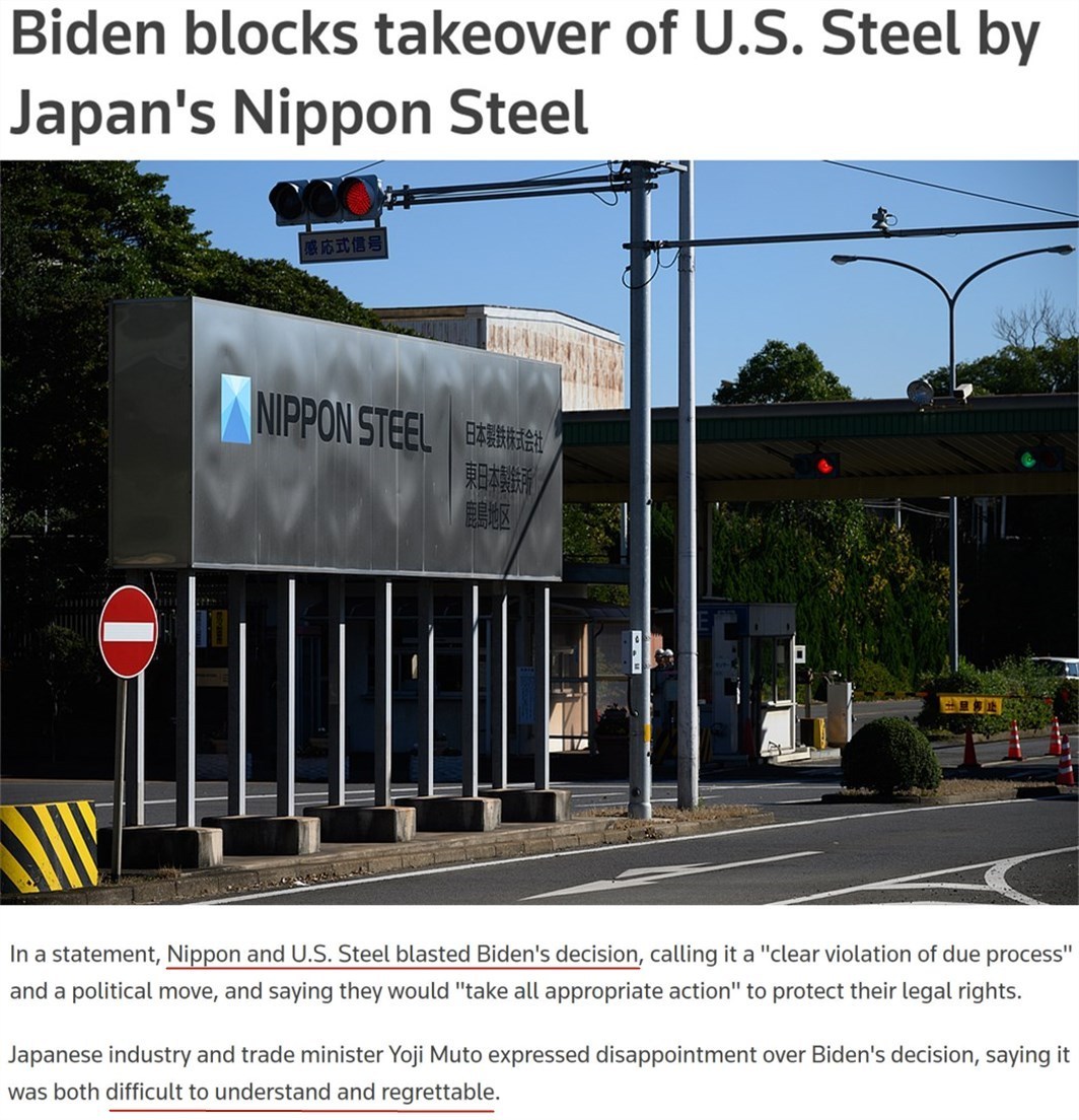 雖然日鐵多次讓步,但美國(guó)總統(tǒng)拜登當(dāng)?shù)貢r(shí)間3日發(fā)表聲明,正式阻止了這筆價(jià)值2萬億日元(按目前匯率約合127億美元)的交易。